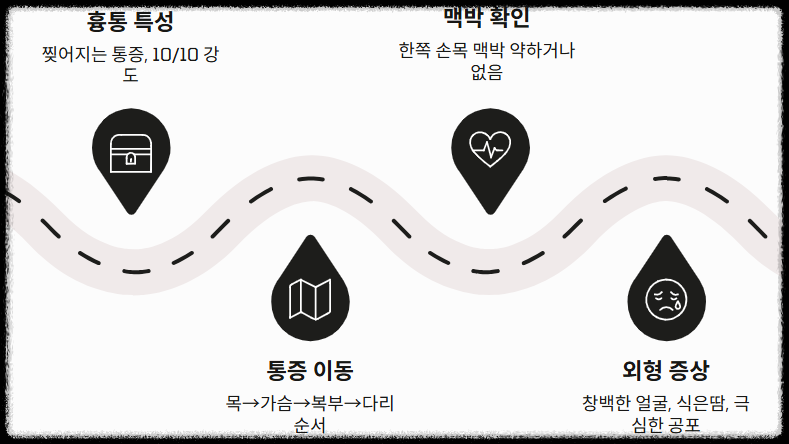 - 통증의 시작과 전이: 처음에는 앞가슴에서 시작된 통증이 순식간에 등이나 견갑골(날개뼈) 사이, 혹은 배 쪽으로 이동합니다. 이는 박리가 진행되는 방향을 따라 통증이 '이동'하기 때문입니다. [출처: 서울대학교병원 의학정보]
