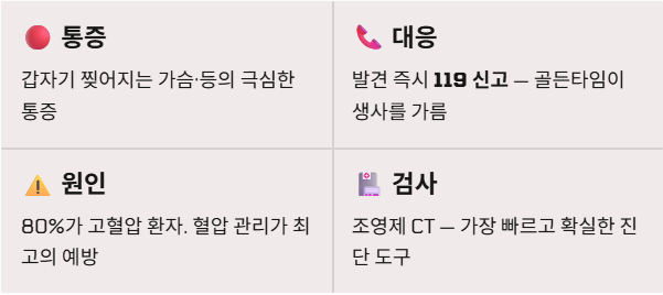 ⚠️ 면책 조항 (Disclaimer): 본 콘텐츠는 일반적인 의학 정보 전달을 목적으로 작성되었으며, 전문의의 진단이나 처방을 대신할 수 없습니다. 대동맥박리가 의심되는 응급 상황에서는 즉시 119에 연락하여 전문적인 처치를 받으시기 바랍니다.