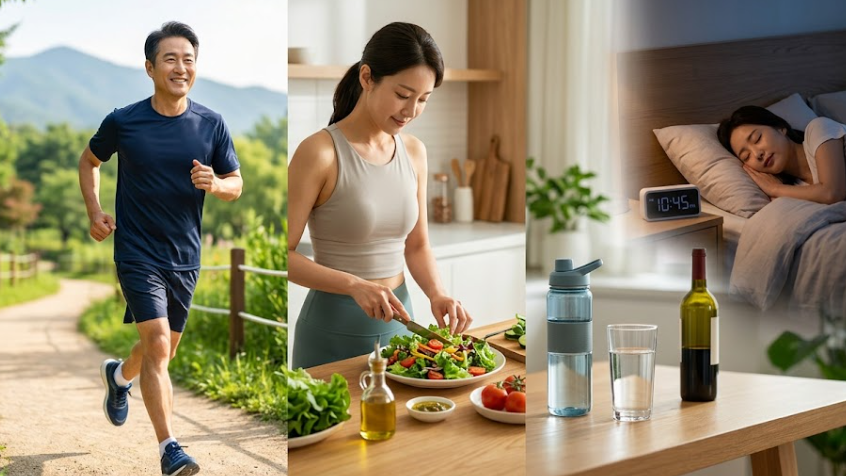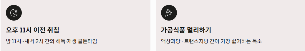 - 충분한 수면 (오후 11시 이전): 한의학적으로나 현대 의학적으로 밤 11시에서 새벽 2시는 간의 해독과 재생이 가장 활발한 시간입니다.