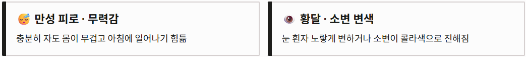 - 황달 및 소변 색 변화: 눈의 흰자위가 노랗게 변하거나 소변 색이 진한 갈색(콜라색)으로 변합니다.