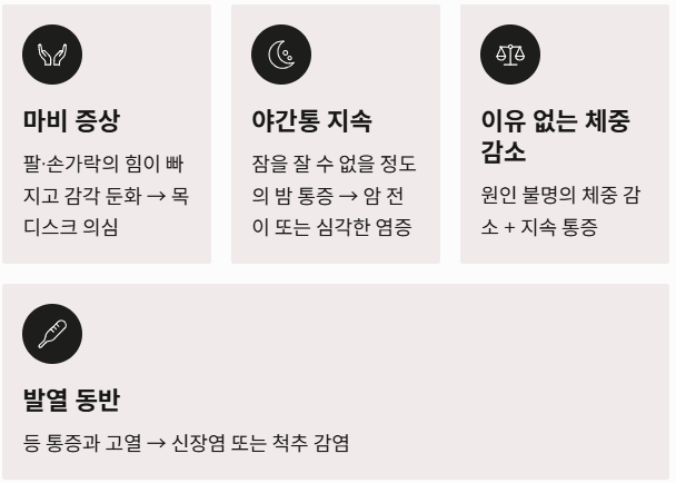 단순히 파스를 붙이고 며칠 쉬면 낫는 통증이 있는 반면, 골든타임을 놓치면 안 되는 경우가 있습니다. 아래와 같은 증상이 있다면 지체하지 말고 정밀 검사를 받으셔야 합니다.