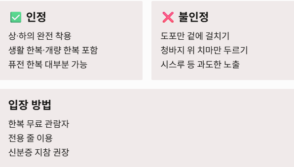 - 하의 기준: 남성은 바지, 여성은 치마가 기본입니다. 과도한 노출이 있는 시스루 한복 등은 거부될 수 있습니다.