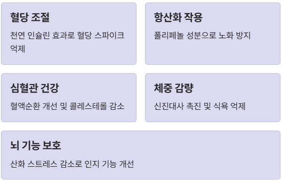 - 강력한 항염 및 항산화 작용: 폴리페놀 성분이 풍부하여 체내의 유해한 활성산소를 제거하고 노화 방지 및 만성 염증 수치를 낮추는 데 기여합니다.