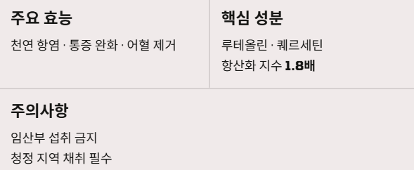 - 근육통 및 관절염 완화 (수치적 근거): 민간요법에서 '근육통 치료제'로 쓰인 이유가 과학적으로 입증되었습니다. 추출물 투여 시 대조군 대비 통증 유발 물질 수치가 약 35% 감소했다는 실험 데이터가 존재하며, 특히 류마티스 관절염 초기 증상 완화에 긍정적인 신호를 보입니다.