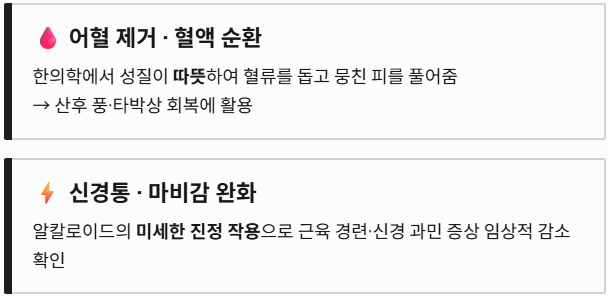 - 어혈 제거 및 혈액 순환 개선: 한의학에서는 성질이 따뜻하여 혈액의 흐름을 돕고 뭉친 피(어혈)를 풀어주는 데 사용합니다. 이는 산후 풍 증상이나 타박상 회복 속도를 높이는 데 도움을 줄 수 있습니다.