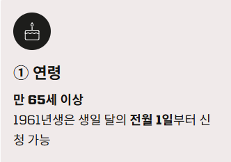 1. 연령: 만 65세 이상 (2026년 기준 1961년생 생일 달의 전월부터 신청 가능)