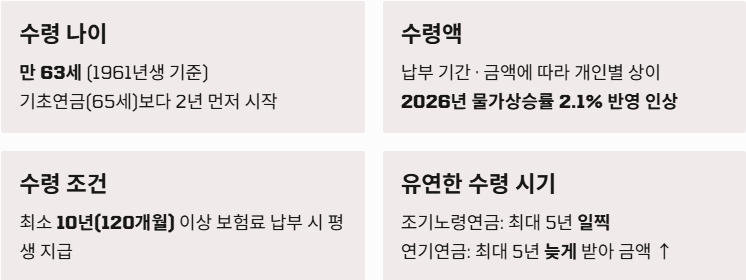 | 수령 나이 | 만 63~65세 (출생연도별 상이) | 만 65세 고정 |