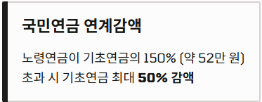 - 기초연금-국민연금 연계감액: 노령연금 수령액이 기초연금액의 150%(2026년 기준 약 52만 원)를 초과하면 기초연금이 최대 50%까지 감액될 수 있습니다.