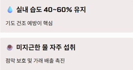 - 적정 습도 유지: 실내 습도를 40~60%로 유지하여 기도가 건조해지지 않게 하세요.