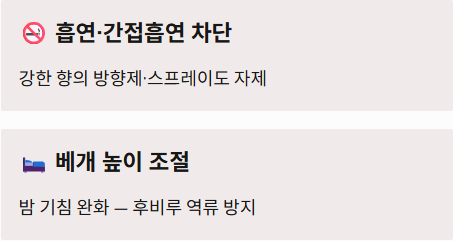 - 자극 피하기: 흡연, 간접흡연, 향이 강한 방향제나 스프레이 사용을 자제합니다.