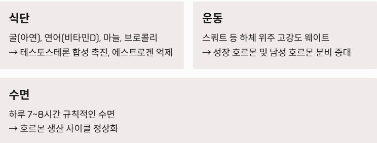 | 식단 | 굴(아연), 연어(비타민D), 마늘, 브로콜리 | 테스토스테론 합성 촉진 및 에스트로겐 억제 |