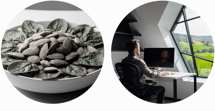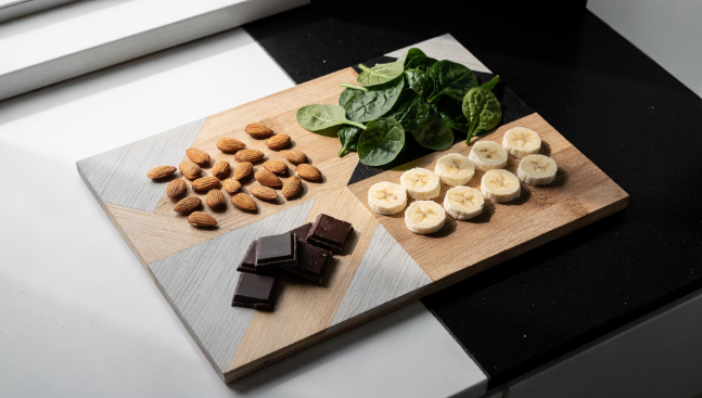 - 마그네슘 풍부한 음식 섭취: 아몬드, 바나나, 시금치, 다크초콜릿 등을 챙겨 드세요.