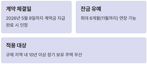 - 적용 대상: 규제 지역 내 10년 이상 장기 보유 주택 우선