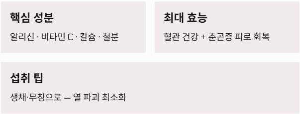 비타민 C는 백혈구의 활동을 지원하여 기초 면역력을 높이고, 알리신은 직접적인 항바이러스 작용을 수행합니다. 이러한 복합 작용은 환절기 급격한 기온 차로 인해 면역력이 30% 이상 급감하는 시기에 신체 방어력을 견고하게 유지해 줍니다.