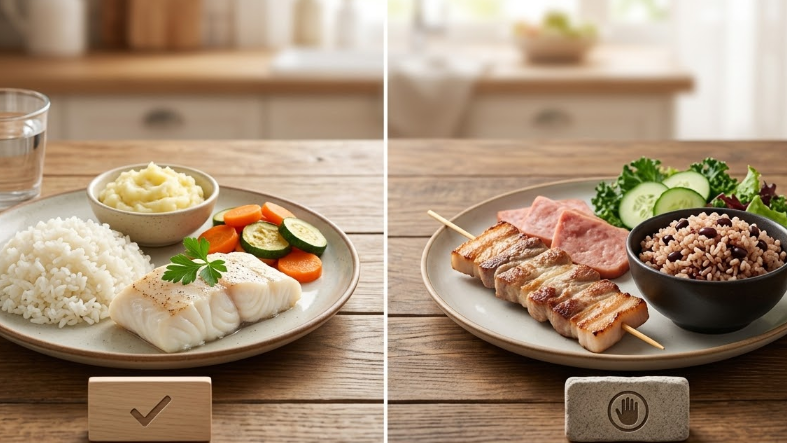 | 단백질 | 흰살생선, 두부, 달걀, 닭가슴살 | 삼겹살, 햄, 장어, 기름진 갈비 |