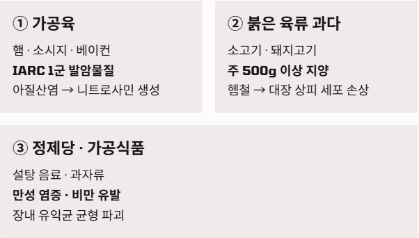 2. 대장암 위험을 높이는 절대 피해야 할 음식 3가지는? 🚫