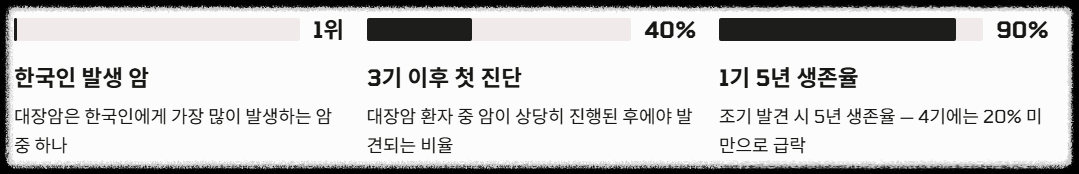 국가암관리위원회(2026)의 '제5차 암관리종합계획' 데이터에 따르면, 대장암 환자의 약 40%가 암이 상당히 진행된 3기 이후에나 첫 진단을 받는 것으로 나타났습니다. 이는 대장의 감각 신경이 타 장기에 비해 무딘 편이고, 종양이 자랄 수 있는 충분한 공간이 있기 때문입니다.