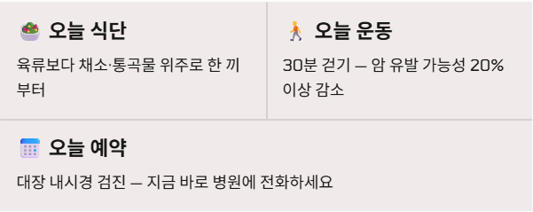 - 고식이섬유 식단 실천: 하루 25~30g 이상의 식이섬유를 섭취하면 장내 발암 물질을 희석하고 배변을 도와 암 발생률을 낮춥니다.