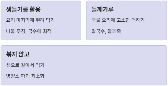 다만 주의할 점은 들깨의 오메가-3는 열에 취약하고 쉽게 산패될 수 있다는 점입니다. 따라서 볶은 들깨가루보다는 생들기름을 요리 마지막에 뿌려 드시거나, 가루 형태는 냉동 보관하며 가급적 빨리 드시는 것이 좋습니다. 오늘 저녁에는 고소한 들깨 칼국수나 들기름을 곁들인 나물 반찬으로 건강한 식탁을 차려보시는 건 어떨까요? 😊