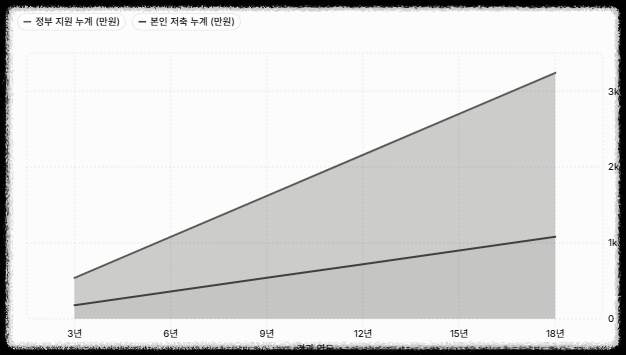 매달 5만 원을 저축하면 정부 지원금 10만 원이 더해져 총 15만 원이 쌓입니다. 만약 18년 동안 꾸준히 저축한다면 이자를 제외하고도 원금만 3,240만 원이라는 큰 금액이 만들어집니다!
