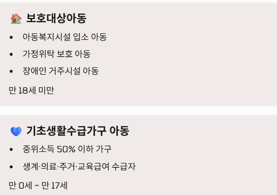 - 보호대상아동: 만 18세 미만의 아동복지시설 입소 아동, 가정위탁 보호 아동, 장애인 거주시설 아동 등