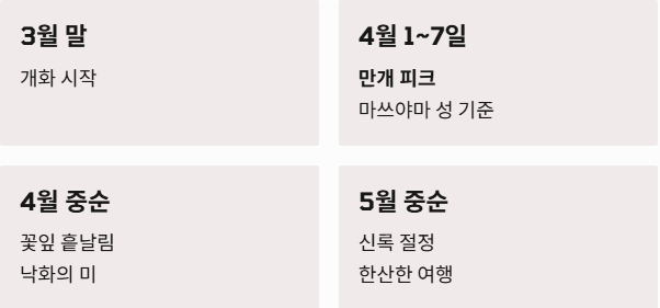- 개화 시기: 보통 3월 말 ~ 4월 초 (마쓰야마 성 기준)