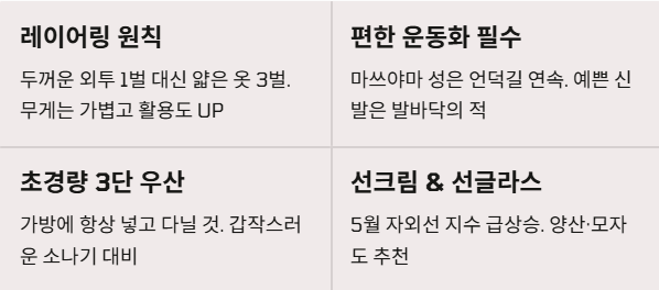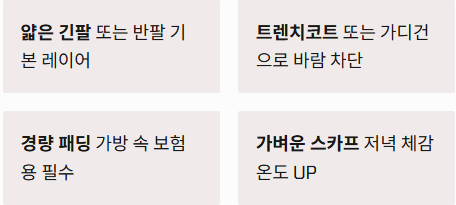 - 필수 아이템: 가벼운 스카프, 휴대용 손난로(추위 타는 분들)
