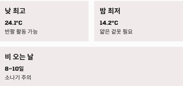 - 평균 기온: 최저 14.2°C ~ 최고 24.1°C (초여름 날씨 시작)