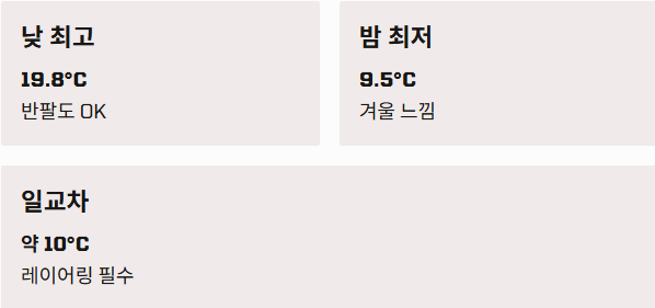 - 추천 옷차림: 얇은 긴팔 상의 + 트렌치코트 또는 가디건 (레이어링 필수)