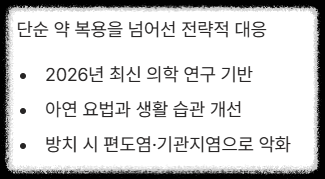 의학적 면책 조항(Disclaimer): 본 포스팅에서 제공하는 정보는 일반적인 건강 정보를 목적으로 하며, 전문적인 의학적 진단이나 치료를 대신할 수 없습니다. 증상이 심각하거나 지속될 경우 반드시 전문 의료기관을 방문하여 전문가와 상담하시기 바랍니다.