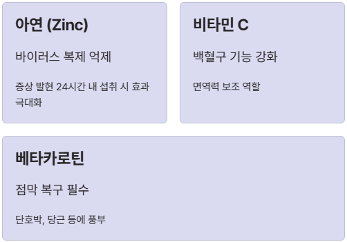 - 아연(Zinc): 바이러스의 증식을 억제합니다. 초기 증상 발현 24시간 이내 섭취 시 효과가 극대화됩니다.