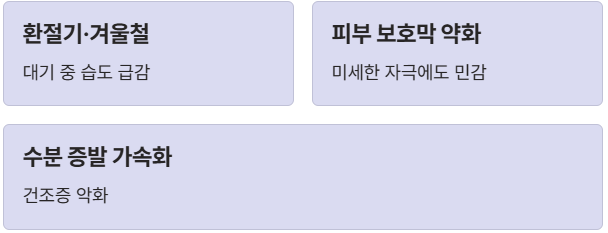 가장 먼저 의심해 볼 수 있는 원인은 역시 피부 건조(건조증)입니다. 특히 요즘같이 찬 바람이 부는 환절기나 겨울철에는 대기 중 습도가 낮아지면서 피부 속 수분이 순식간에 증발해 버리죠. 피부 보호막이 약해지면 미세한 자극에도 가려움을 느끼게 됩니다.