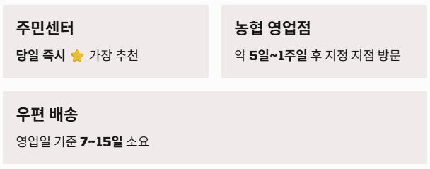 - 농협 영업점 수령: 신청 후 약 5일~1주일 뒤 지정 지점 방문 수령
