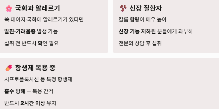 - 신장 질환자: 칼륨 함량이 매우 높아 신장 기능이 저하된 분들에게는 부담을 줄 수 있습니다.