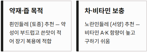 - 노란민들레 (서양): 흔히 볼 수 있는 종으로 비타민 A와 K 함량이 매우 높습니다. 쓴맛이 강해 차로 마실 때 궁합이 좋습니다.