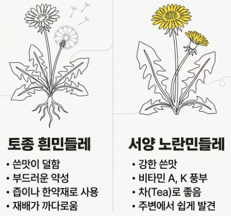 - 흰민들레 (토종): 쓴맛이 덜하고 약성이 부드러워 즙이나 약재로 주로 쓰입니다. 생존력이 약해 재배가 까다롭습니다.