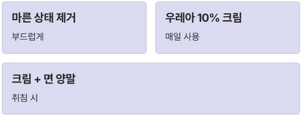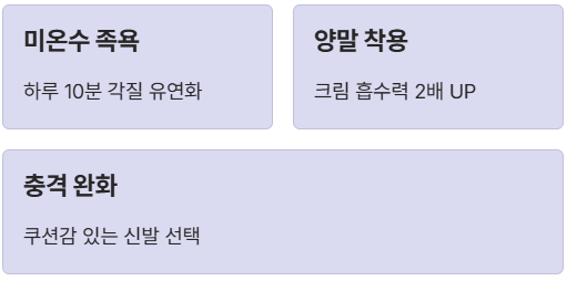 - 미온수 족욕: 하루 10분, 피로를 풀며 각질을 유연하게 만듭니다.