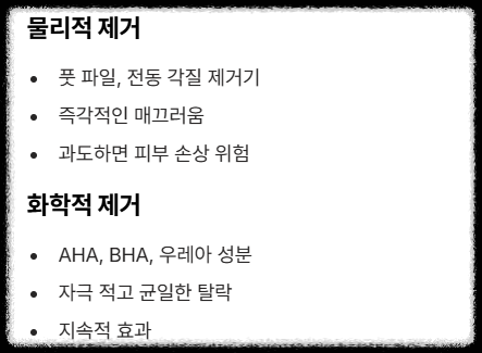 | 화학적 제거 | AHA, BHA, 우레아(Urea) | 자극이 적고 균일한 탈락 |