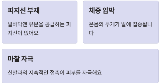 - 충격 완화: 딱딱한 신발보다는 쿠션감이 있는 신발을 선택해 마찰을 최소화하세요.