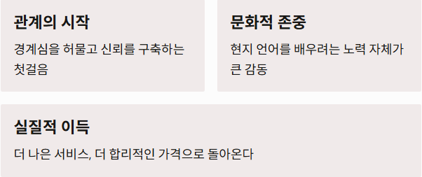 - 문화적 존중: 현지 언어를 배우려는 노력 자체가 상대방에게 큰 감동을 줍니다.