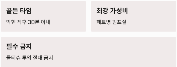 - 샴푸와 뜨거운 물: 변기에 샴푸를 넉넉히(3~5번 펌핑) 넣고 30분 뒤 뜨거운 물을 확 부어주세요. 샴푸의 계면활성제가 이물질을 미끄럽게 만들어줍니다.