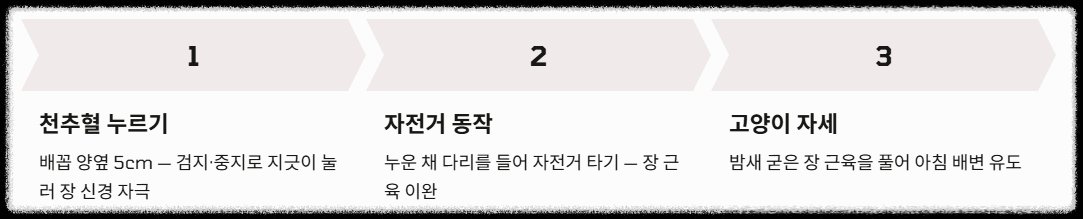 - 장 자극 포인트 누르기: 배꼽 양옆 약 5cm 지점인 '천추혈'을 검지와 중지로 지긋이 누르면 장 신경이 자극되어 배변 욕구가 생길 수 있습니다.