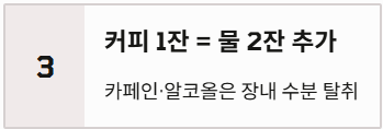 - 카페인과 알코올의 역설: 커피나 술은 이뇨 작용을 촉진하여 오히려 장내 수분을 빼앗아 갑니다. 커피 한 잔을 마셨다면 같은 양의 물 두 잔을 추가로 마셔야 변비를 예방할 수 있습니다.