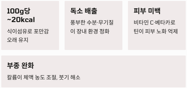 - 독소 배출 효과: 풍부한 수분과 무기질이 체내 노폐물 배출을 돕고, 장내 환경을 정화하여 다이어트 시 발생하기 쉬운 변비를 해결해 줍니다.