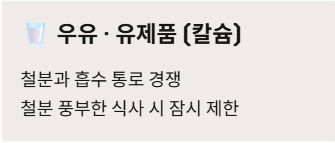 - 우유와 유제품 (칼슘): 칼슘과 철분은 체내 흡수 통로가 같습니다. 과도한 칼슘 섭취는 철분의 흡수를 방해하므로, 철분 함량이 높은 식사를 할 때는 우유를 잠시 멀리하세요.