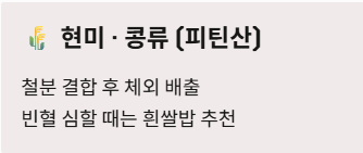- 현미와 콩류의 피틴산: 식이섬유가 풍부한 현미는 건강에 좋지만, 피틴산 성분이 철분과 결합하여 흡수를 방해합니다. 빈혈이 심할 때는 현미보다 흰쌀밥에 고기 반찬을 곁들이는 것이 유리할 수 있습니다.