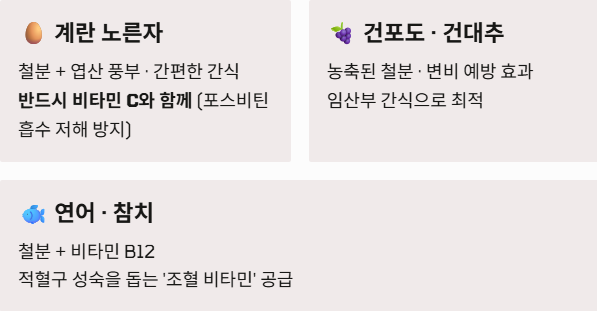 | 과일 시너지 | 식사 후 오렌지/딸기 | 비타민 C 75mg 섭취 시 철분 흡수율 최대 2.5배 증가 |