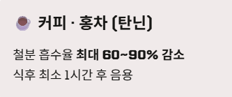 - 커피와 홍차 (탄닌): 커피의 탄닌 성분은 철분 흡수율을 최대 60~90%까지 떨어뜨립니다. 식후 바로 마시는 커피는 철분 섭취를 무력화하므로 최소 1시간 이상의 간격을 두세요.