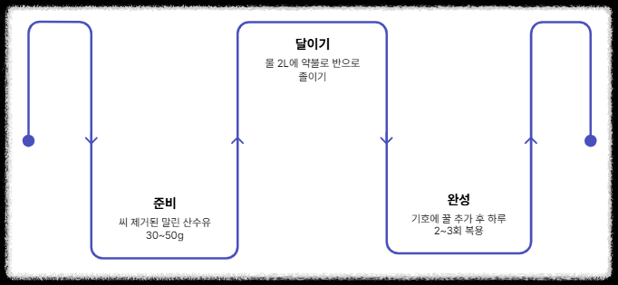 - 물 2L에 산수유를 넣고 약불에서 물의 양이 절반이 될 때까지 달입니다.