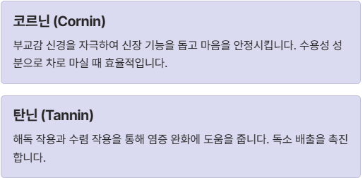 - 코르닌(Cornin): 부교감 신경을 자극하여 신장 기능을 돕고 마음을 안정시킵니다.
